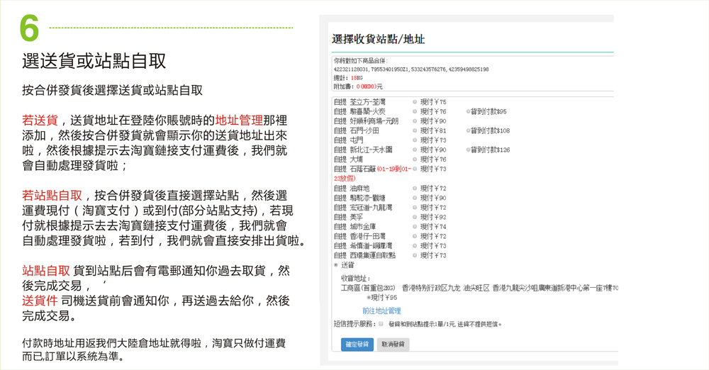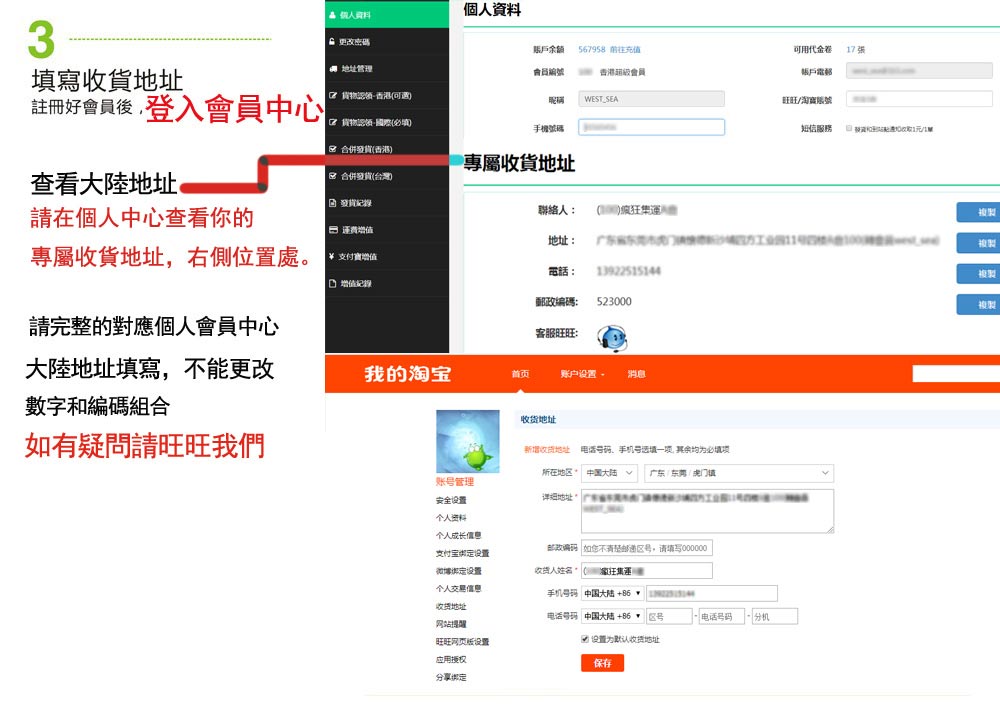 使用你的個人集運地址作為網購訂單的收貨地址。你需要使用完整的集運地址資料,包括收貨地址、收件人、聯系電話及郵政編號。( 注意:淘寶付款時請選擇「賣家直送」,而非「官方集運」 )
