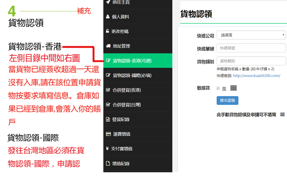 登入網頁,進入「申請集運」->「貨物認領」頁面; 將包裏的物流資料,包括快递公司、快递單號、貨物名稱,填寫入對應的輸入位置中,然後點擊「提交認領」。