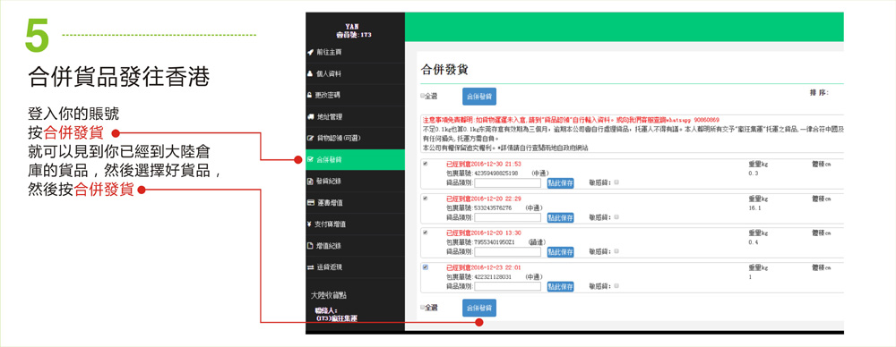 登入網站,進入「會員中心」->「合併發貨」頁面;當包裏已經到庫,該包裏顏色將是紅色,表示該包裏已可進行集運;點選需要集運的包裏單號或者已到倉庫文字。